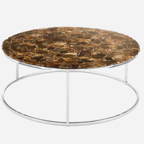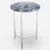 An agate stone side table that introduces rich and unique patterns to luxury interiors. Side table stands on a trio of legs made from smooth iron, with a minimal aesthetic. The legs support a round top made from blue agate stone. The stone has a deep natural coloring,  incorporating a spectrum of color’s that travel through blue, gold, and creamy hues.
