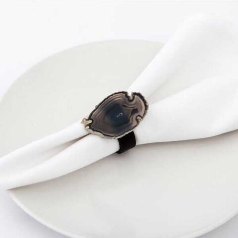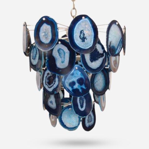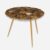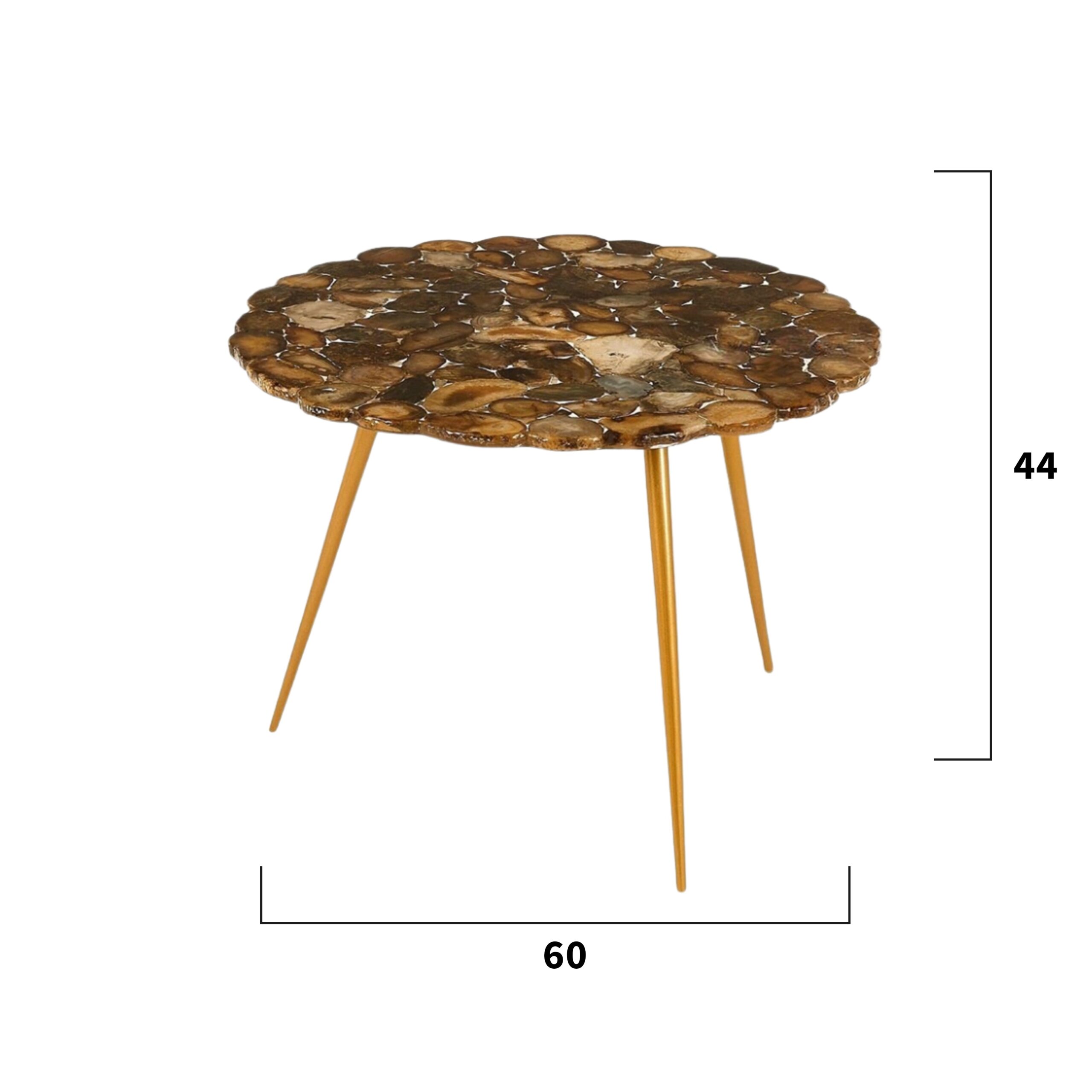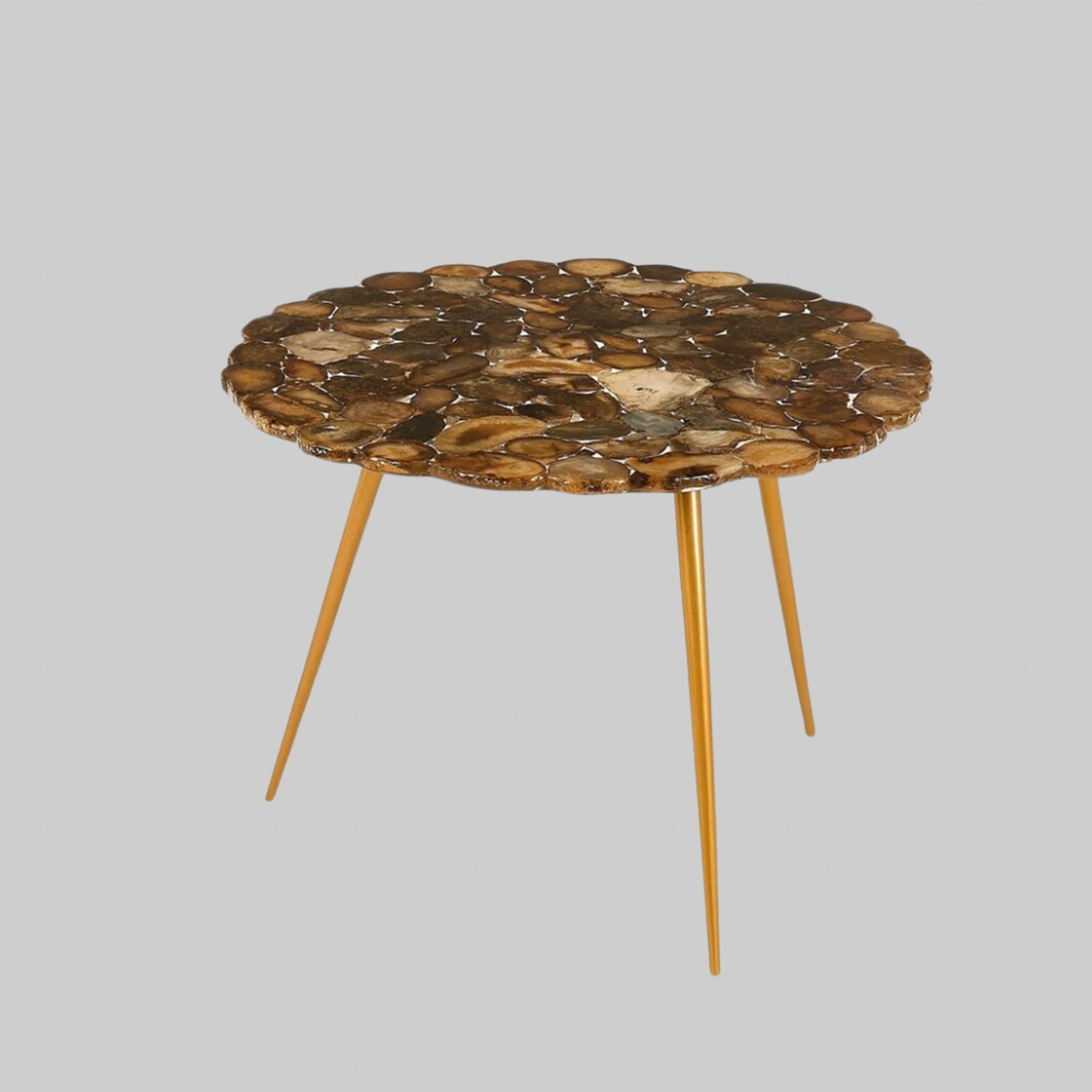 A luxurious side table featuring a natural agate stone top with rich brown, gold, and cream hues, set on sleek brass-finished iron legs for a refined, modern look.